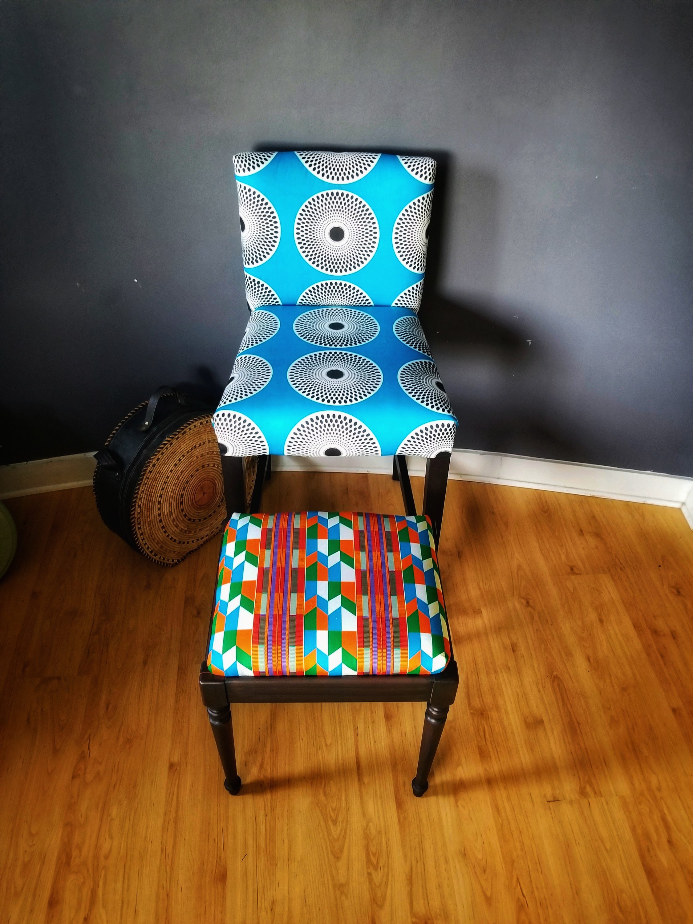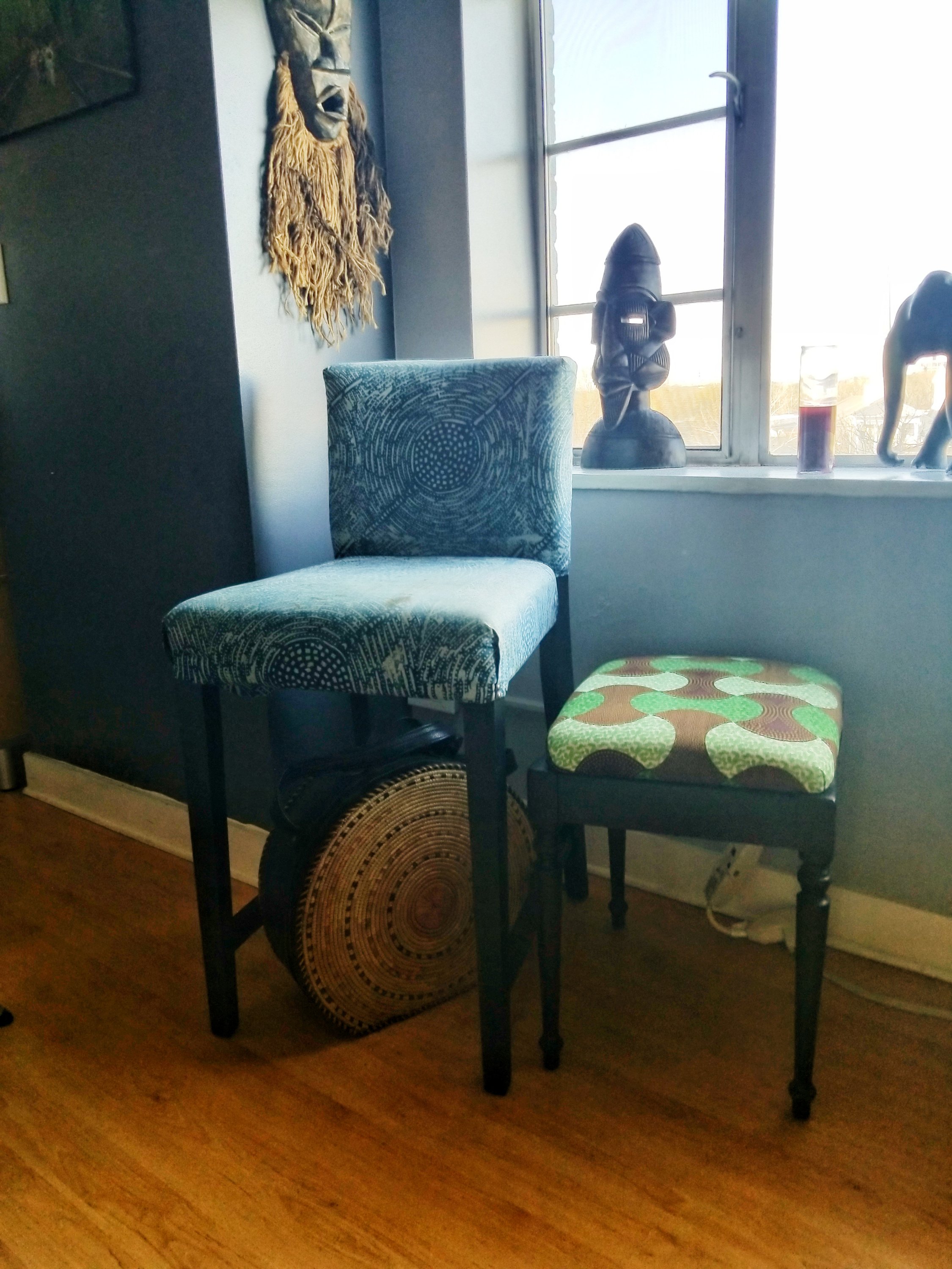 I can’t lie, I was little nervous about redoing these chairs we upholstered three years ago and then lining up those circles was intimidating; I wanted to make my mama proud (she’s the professional upholsterer). Three hours later I completed my project and sent my mom the photos. She was tickled pink that my the patterns were aligned somewhat perfectly. Mission accomplished, I was able to tap into my creative side before heading back to work, used my fabric joy and made my mom proud. Happiness…………