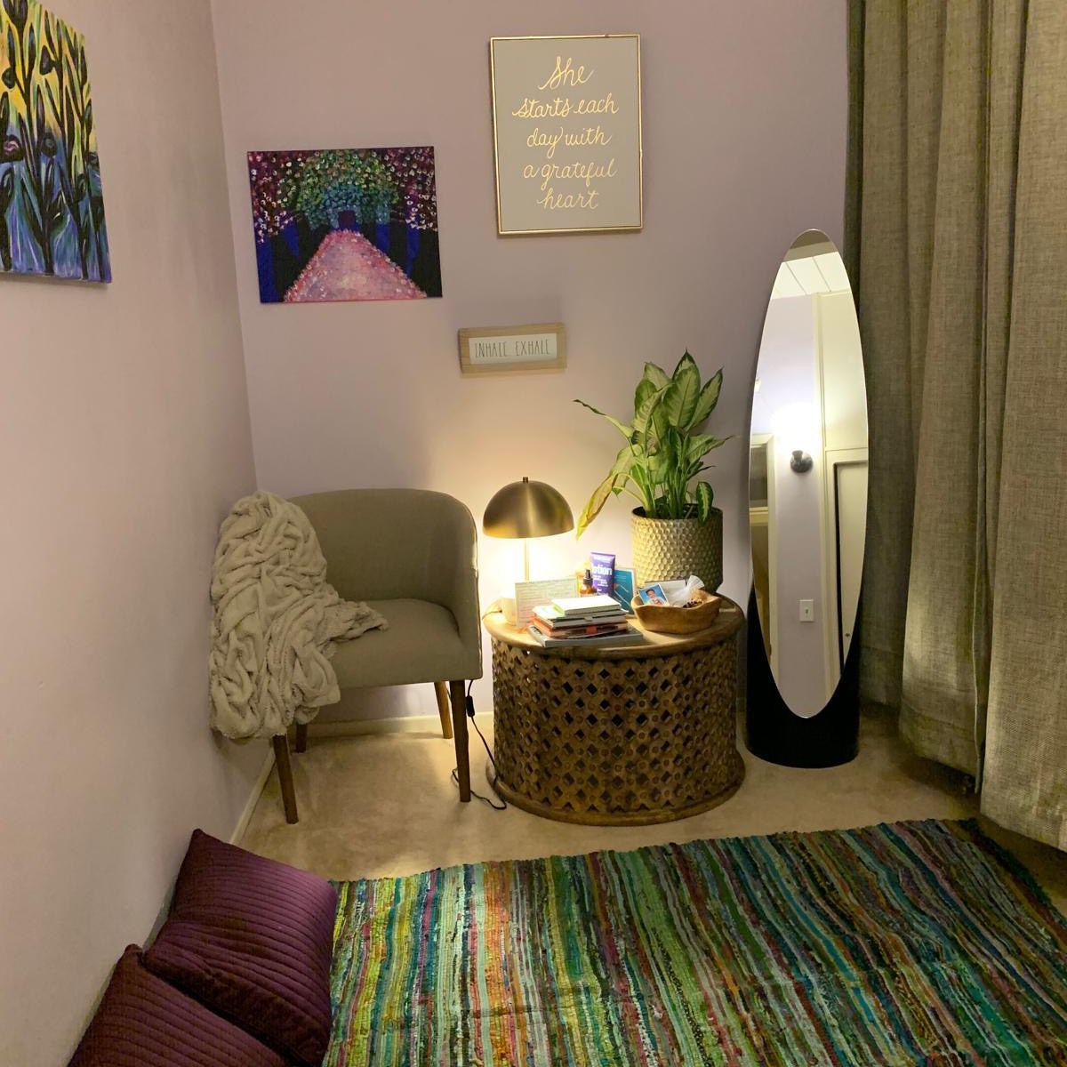 Don’t you believe your home should be your sanctuary? Why not escape to a place that is familiar, safe and always available? Your home! After returning from Portland I created my first sacred space in my then 800 sq ft. condo. Initially I thought I didn’t have enough space, however we make time and space for what’s important. All that was needed was a wall, cushion and an area for a yoga mat. Nothing too fancy, except for the Amazon wall decal that everyone thought I painted! Since then, I have moved and now have two sacred spaces. The first being the meditation/yoga room and the second is the bathroom with a soaking tub. .